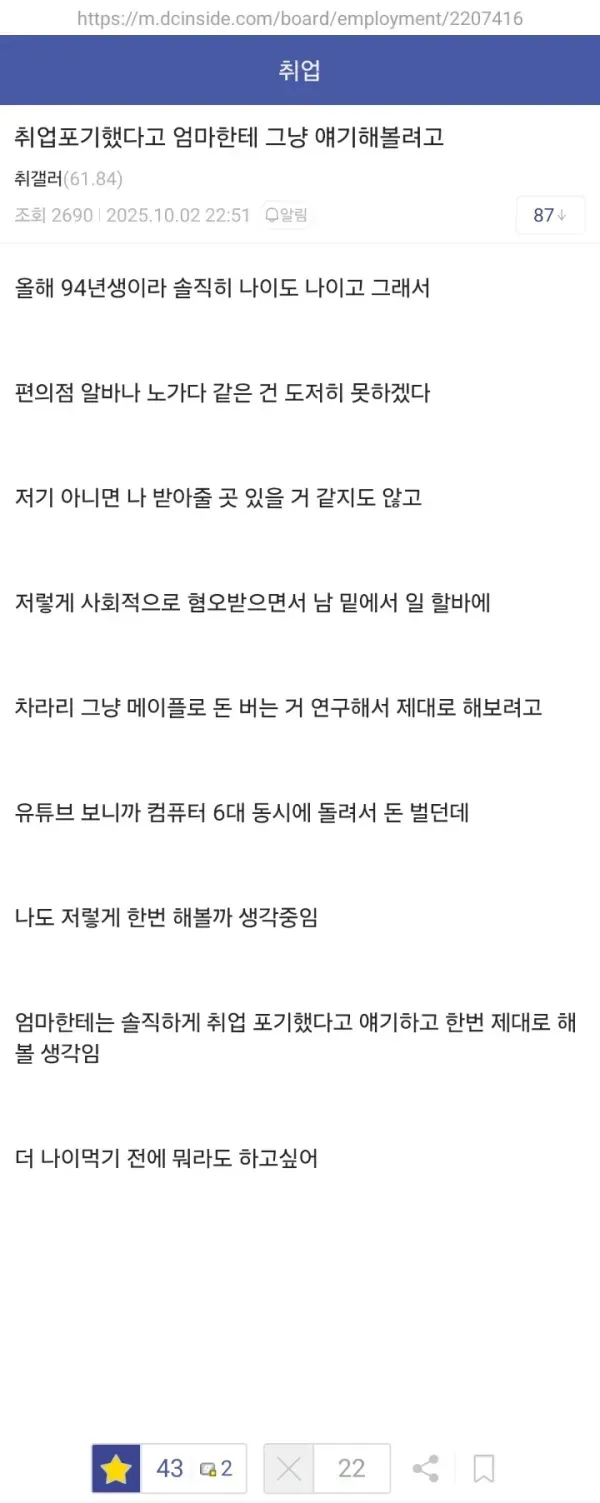 취업 포기하고 메플 쌀먹하려는 94년생 [image: 1769840163175-thumb-f114e82f8d2b8b9f03854740d4efe0d0_a1b23vfs_7bd83b8ec59fdf33fb5629a0281cecda7438d717_600x1503.webp] [image: 1769840166618-thumb-f114e82f8d2b8b9f03854740d4efe0d0_xsn8ydw4_c7bf59e0e2648286ea45e589b1547d4bbc1a5fae_600x1655.webp]