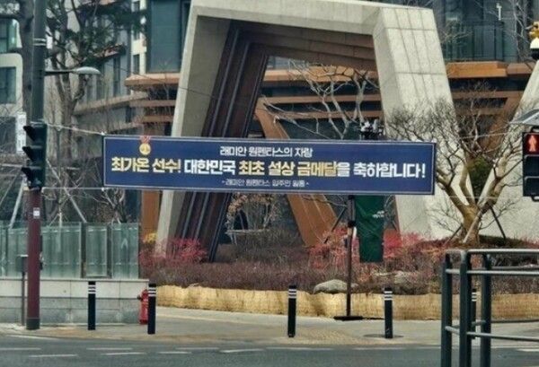 서울 서초구 반포동의 초고가 아파트 '래미안 원펜타스'는 최가온의 금메달 소식이 알려진 후 얼마 지나지 않아 대형 현수막 사진을 걸었다. 현수막엔 "최가온 선수! 대한민국 최초 설상 금메달을 축하합니다. 래미안 원펜타스의 자랑"라는 문구가 새겨졌다.