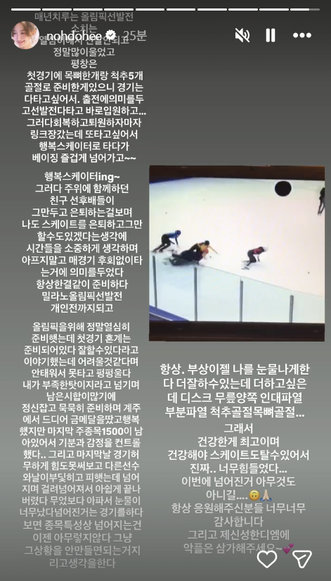 노도희는 경기 다음 날 쇼트트랙 대표팀 기자회견에서 "크게 다친 데가 없어서 잘 회복하면 된다"고 했지만 충돌 당시엔 적지 않게 아팠음을 개인 채널을 통해 공개한 셈이 됐다.