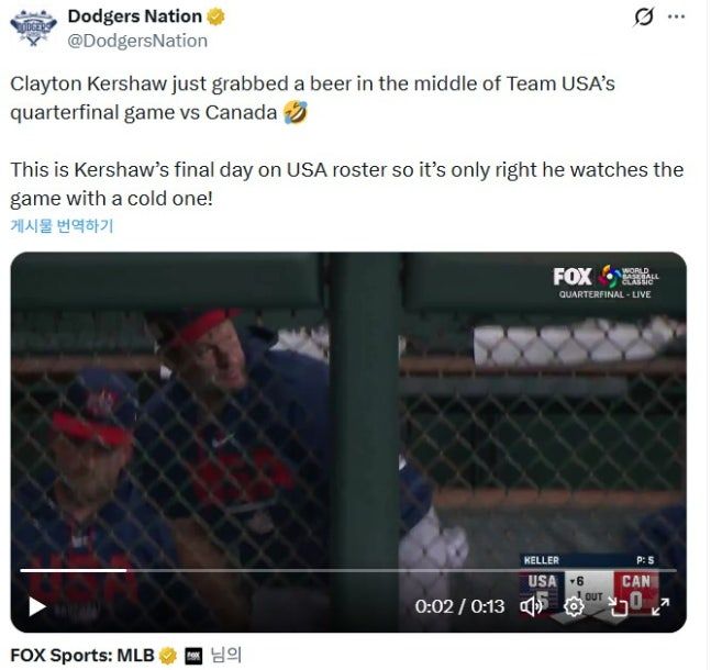 가장 관심을 모았던 커쇼의 등판은 이날도 없었다. 한동안 더그아웃에서 경기를 지켜보던 커쇼는 혹시 모를 등판을 위해 불펜으로 이동했다. 하지만 6회말 미국이 5-0으로 앞서는 상황에서도 그를 부르는 움직임이 없자, 결국 커쇼는 맥주 한 캔을 받아들였다. 미국 매체 다저스 네이션은 이 영상을 올리면서 "커쇼가 미국과 캐나다의 8강전 도중 맥주를 하나 들고 왔다. 오늘은 커쇼가 미국 대표팀 로스터에 포함되는 마지막 날이다. 시원한 맥주와 함께 경기를 보는 것도 좋다"라고 조명했다.